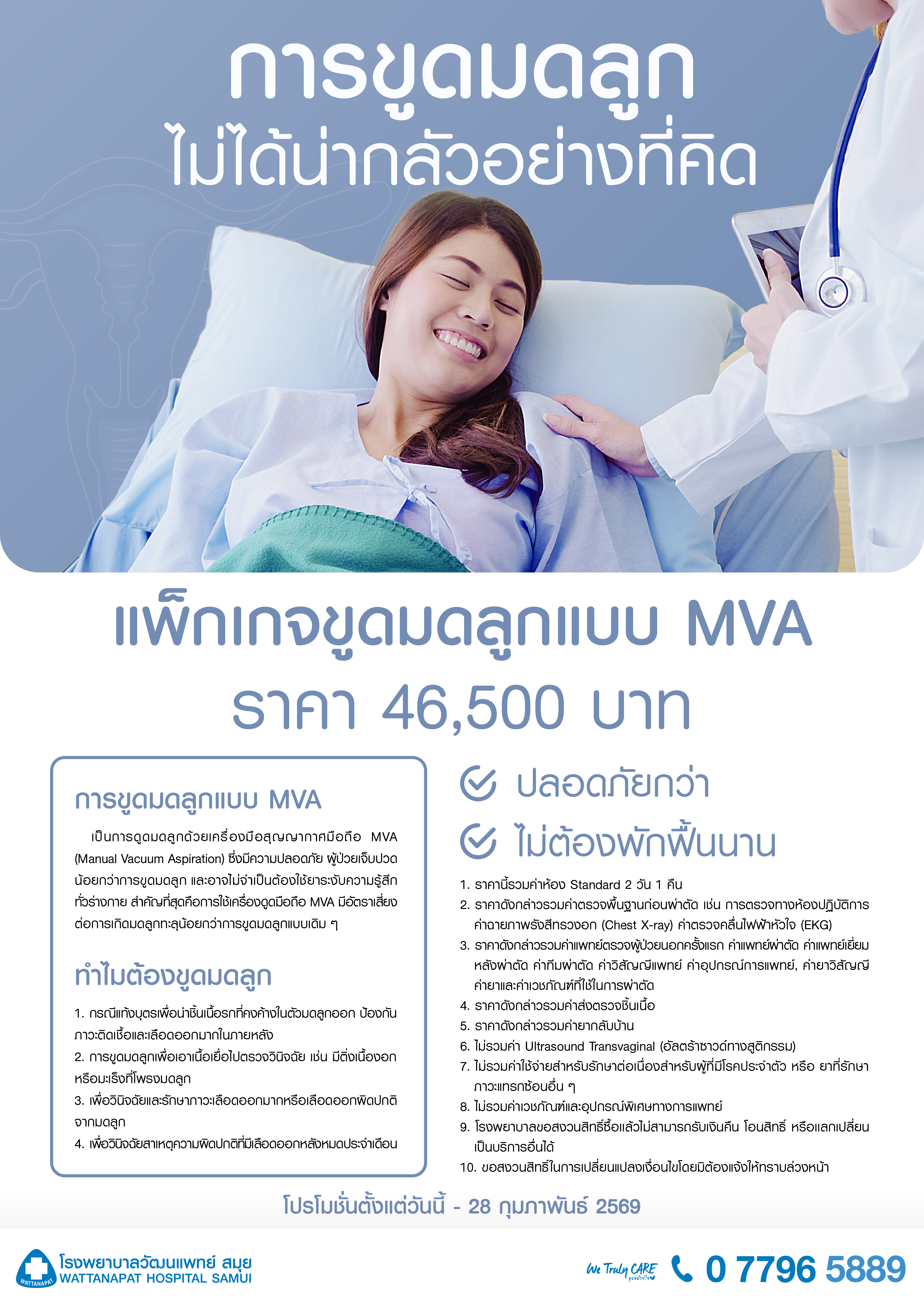 เป็นการดูดมดลูกด้วยเครื่องมือสุญญากาศมือถือ MVA (Manual Vacuum Aspiration) ซึ่งมีความปลอดภัย ผู้ป่วยเจ็บปวดน้อยกว่าการขูดมดลูก และอาจไม่จำเป็นต้องใช้ยาระงับความรู้สึกทั่วร่างกาย สำคัญที่สุดคือการใช้เครื่องดูดมือถือ MVA มีอัตราเสี่ยงต่อการเกิดมดลูกทะลุน้อยกว่าการขูดมดลูกแบบเดิมๆ