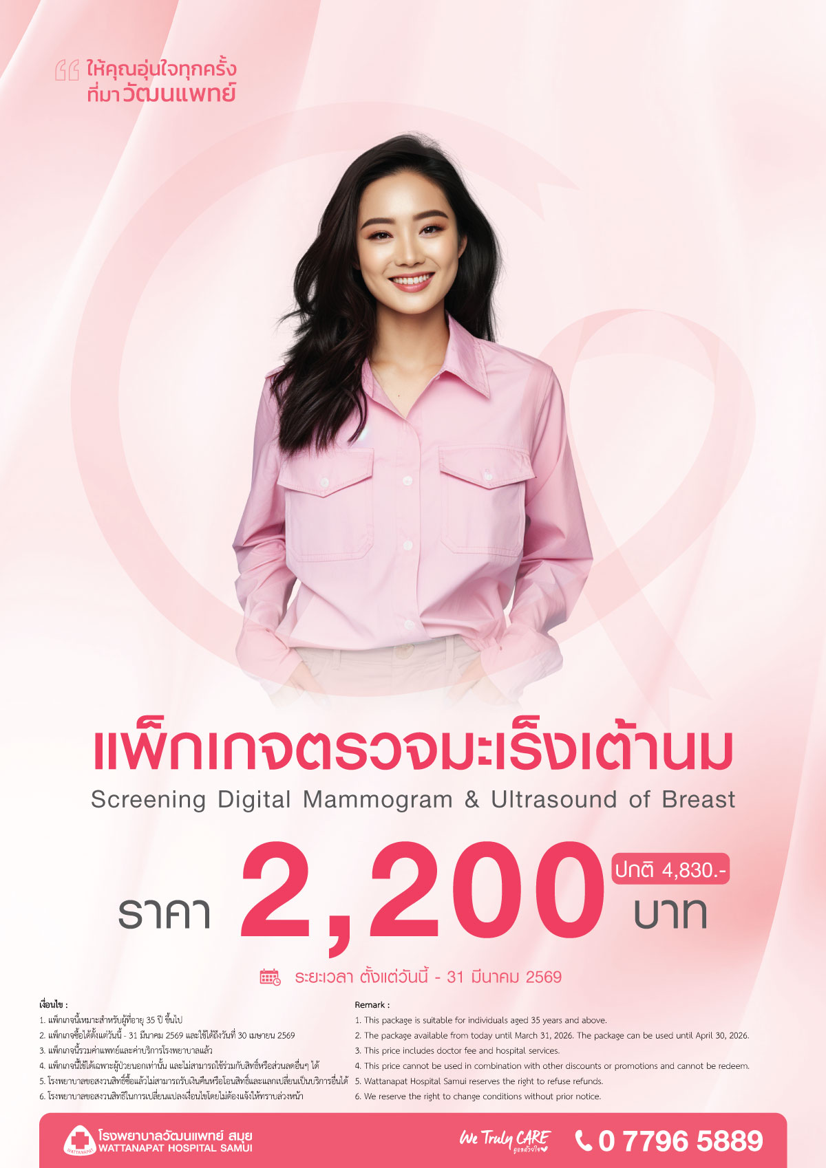 “มะเร็ง” ปัจจุบันถือเป็นโรคที่ร้ายแรงที่สุดโรคหนึ่ง ซึ่งเมื่อเป็นแล้วนั้น โอกาสที่จะรักษาให้หายขาดนั้นเป็นอาจจะเป็นไปได้ หรืออาจจะไม่มีเลย ขึ้นอยู่กับความรุนแรงและตำแหน่งที่เกิดมะเร็ง โดยมะเร็งที่พบมากเป็นอันดับหนึ่งในผู้หญิงไทย คือ มะเร็งเต้านม แม้ว่า “มะเร็งเต้านม” จะเป็นโรคร้ายแรงที่ทำให้เสียชีวิตได้ แต่ผู้หญิงทุกคนสามารถรู้เท่าทันโรคนี้ได้ โดยหมั่นสังเกตบริเวณเต้านมของตนเองในเบื้องต้น ว่ามีสิ่งผิดปกติเกิดขึ้นบ้างหรือเปล่า หากพบอะไรที่น่าสงสัย…อย่าปล่อยทิ้งไว้ ควรรีบมาพบแพทย์โดยเร็วที่สุด