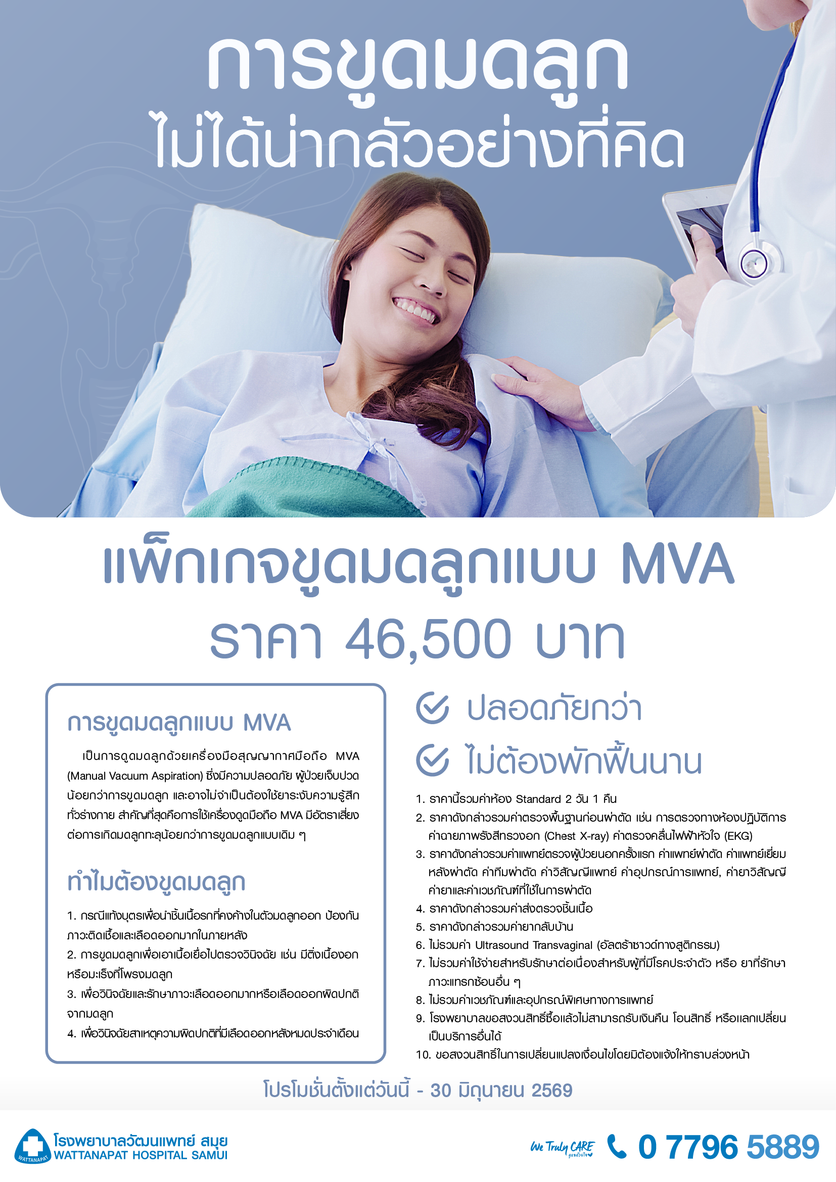 เป็นการดูดมดลูกด้วยเครื่องมือสุญญากาศมือถือ MVA (Manual Vacuum Aspiration) ซึ่งมีความปลอดภัย ผู้ป่วยเจ็บปวดน้อยกว่าการขูดมดลูก และอาจไม่จำเป็นต้องใช้ยาระงับความรู้สึกทั่วร่างกาย สำคัญที่สุดคือการใช้เครื่องดูดมือถือ MVA มีอัตราเสี่ยงต่อการเกิดมดลูกทะลุน้อยกว่าการขูดมดลูกแบบเดิมๆ